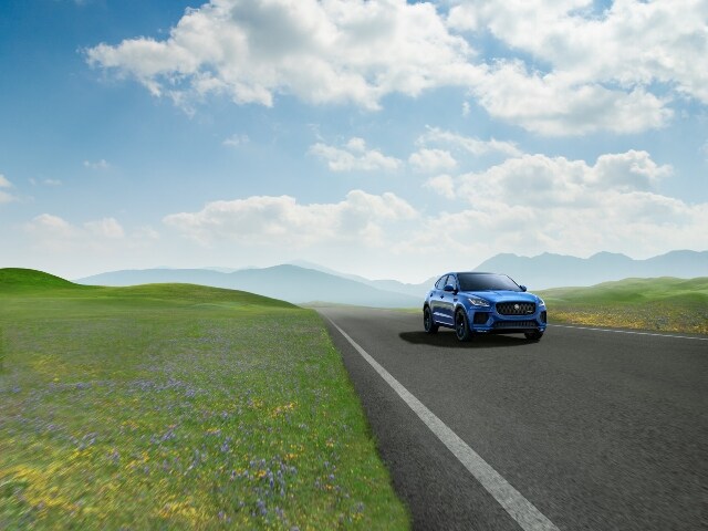 New 2024 Jaguar E-PACE SUV in HoustonJaguar E-PACE driving down scenic city road