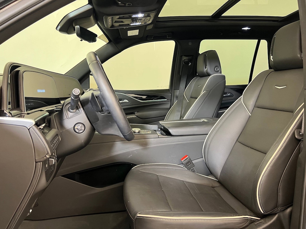 Inside, the Escalade's cabin is a showcase of premium craftsmanship and state-of-the-art features. The expansive interior offers three rows of spacious seating with exceptional comfort for up to seven or eight passengers, depending on configuration. Cadillac's curved OLED display, spanning over 38 inches of total diagonal digital space, anchors the interior with crisp graphics and intuitive controls. The infotainment system includes wireless Apple CarPlay and Android Auto integration, keeping you connected at every turn, while the available AKG Studio Reference audio system surrounds you with concert-quality sound. With thoughtful amenities, including advanced climate control, versatile cargo configurations, and driver-focused technology, the Escalade ensures every trip is elevated.